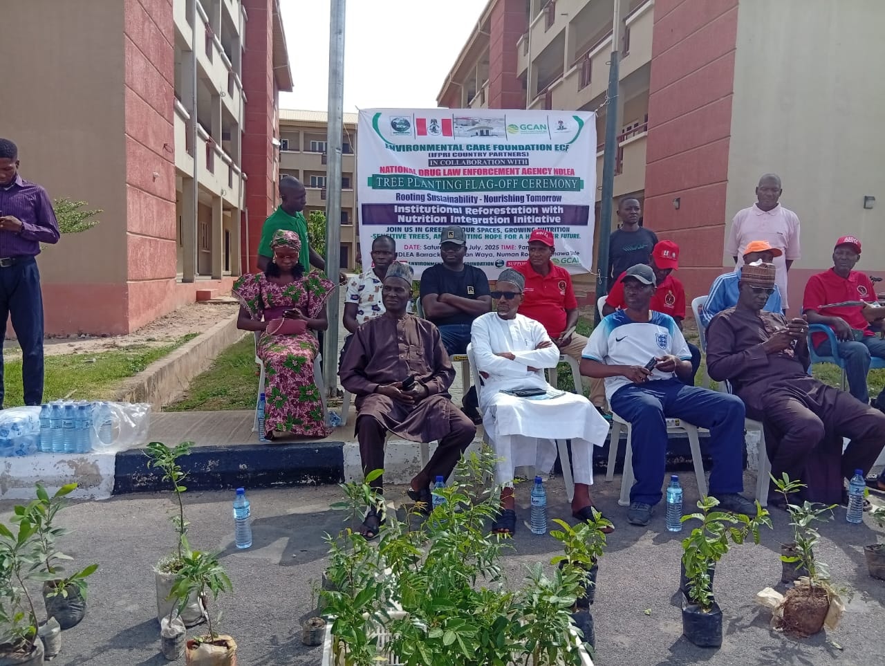 The Environmental Care Foundation (ECF), in collaboration with the National Drug Law Enforcement Agency (NDLEA) Adamawa Zonal Office, the Adamawa State Ministry of Environment, and the newly established Savannah Climate Research Centre (SCRC), has successfully flagged off the Institutional Tree Planting with Nutrition Integration Project. This landmark event took place at the expansive NDLEA Barracks, recently constructed through the leadership of His Excellency General MB Marwa, along Numan Road in Yola, Adamawa State.